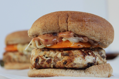 - Assemble the burgers by placing a patty on the bottom bun. Top with the squash, caramelized onions and a dollop of the sauce. Serve immediately.